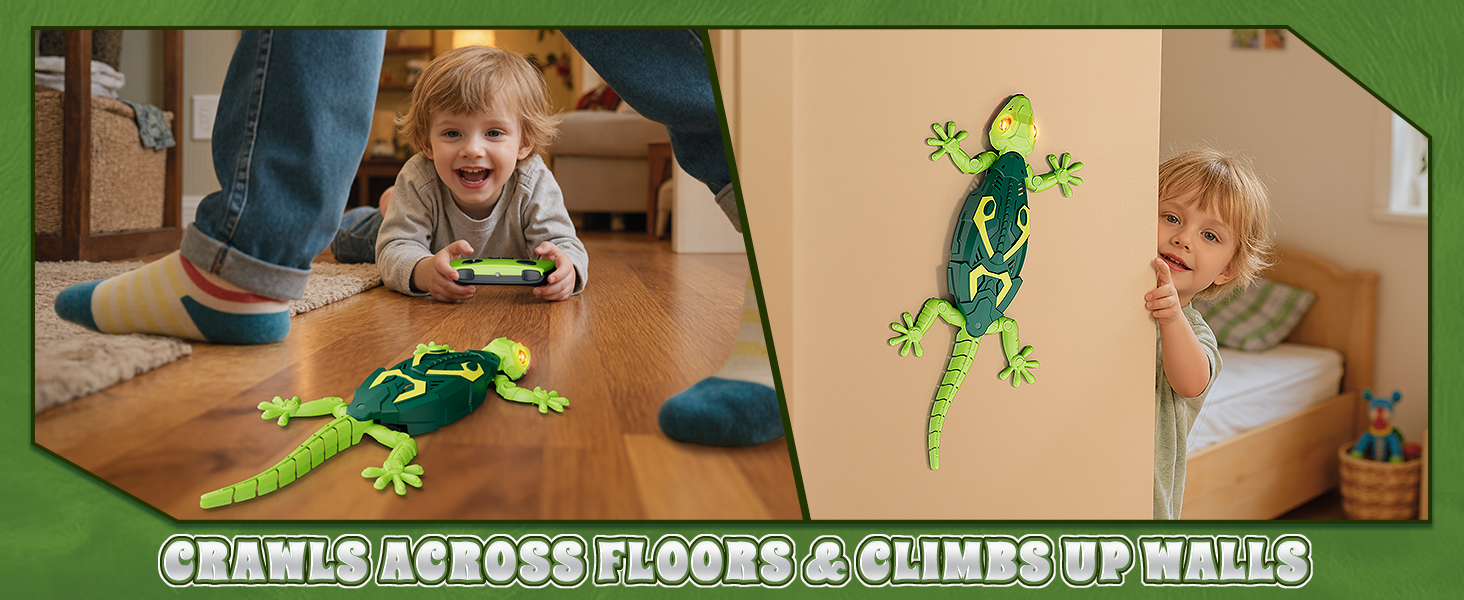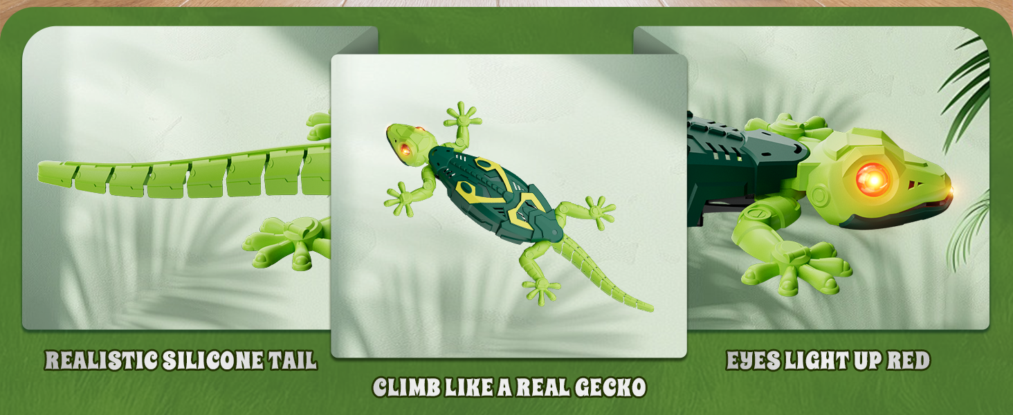 - REALISTIC GECKO DESIGN- Remote-control gecko features glowing LED eyes, a soft silicone tail, and lifelike limb movements—just like a real gecko! Watch it scurry across floors and climb walls with astonishing realism.