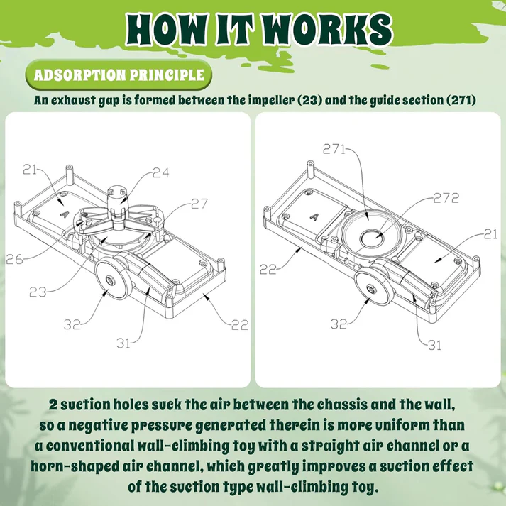• FLOOR CRAWL & WALL CLIMB MODES- Double the fun! Switch to “Ground” mode for normal crawling or “Wall” mode for vertical climbing action. Works best on smooth surfaces – keep away from rough textures.